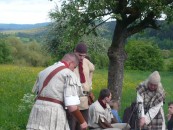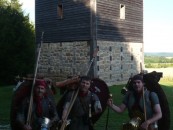 Am Nachmittag wurde am Limesturm in Lorch Stellung bezogen und das Nachtlager aufgebaut. In geselliger Runde baute sich unter den oftmals einander noch unbekannten Marschierern eine vertraute und lustige Gesellschaft auf. Erfahrungen wurden ausgetauscht und sogleich auch neue gesammelt: Feuer machen auf altertümliche Weise, Zubereiten von Puls nach Art der Brittonen (sehr schmackhaft), welcher selbstverständlich mit Cervisia und Wein hintergespült wurde. Wasser & Posca sind doch eher besser auf dem Marsch.