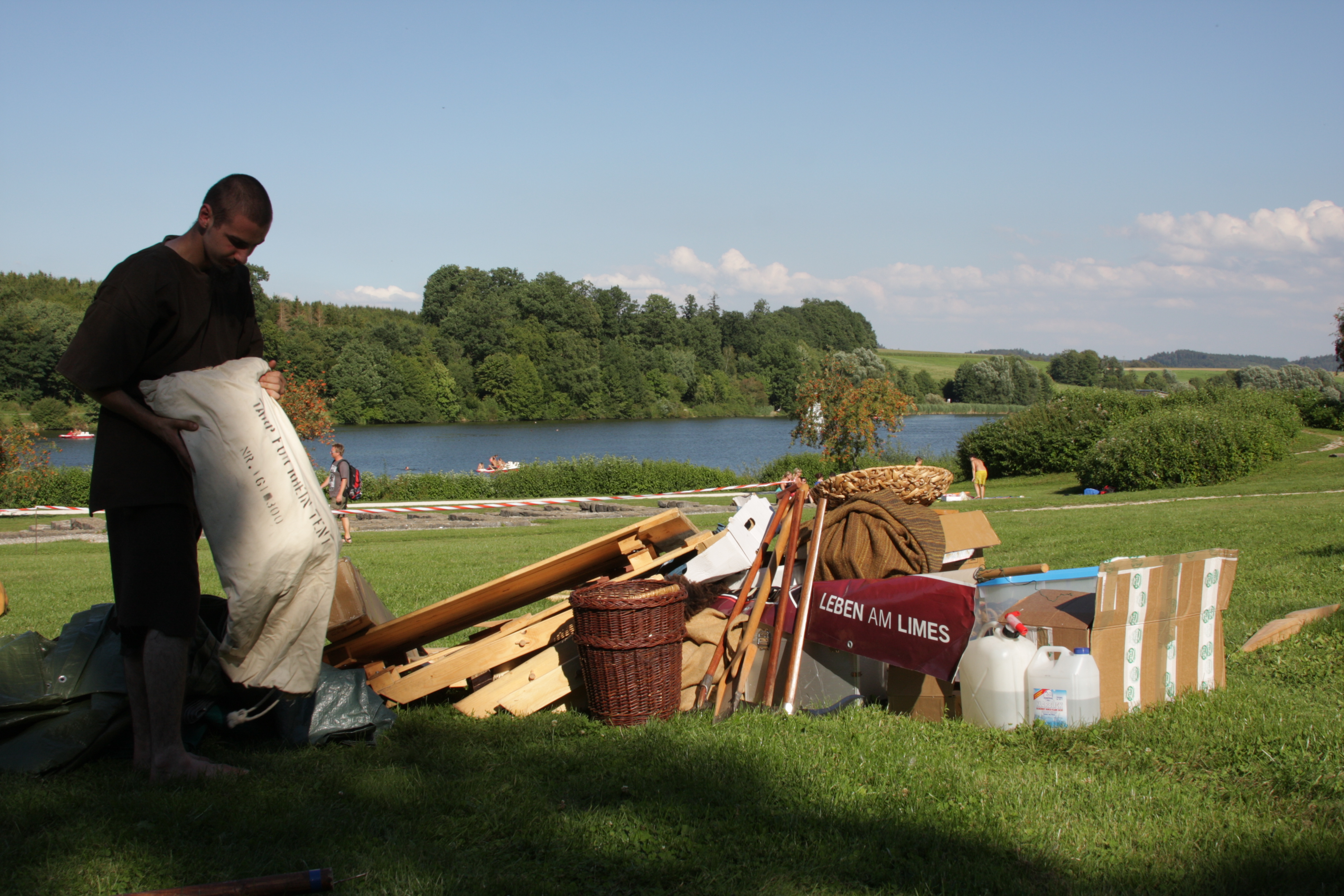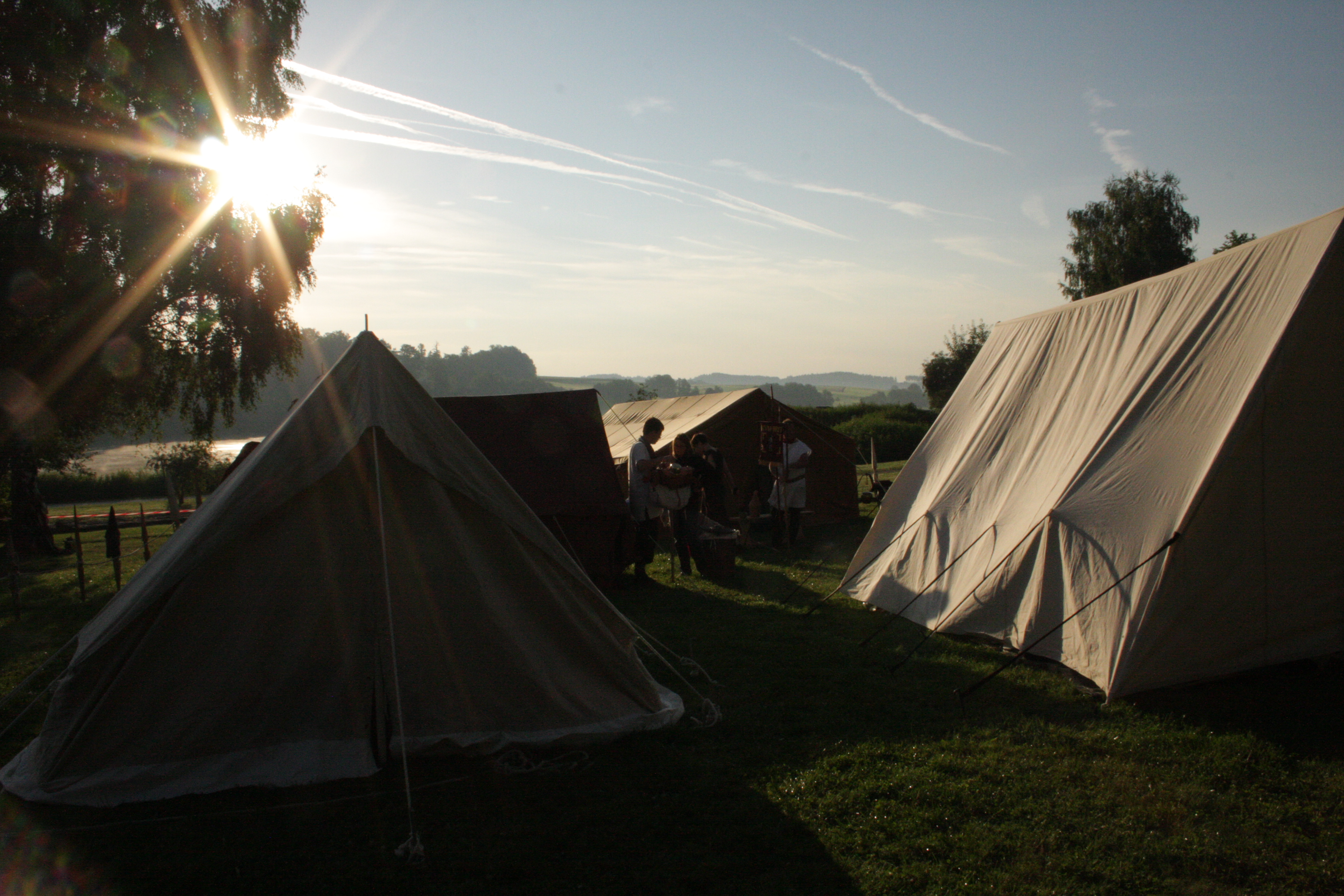 Die Nacht ist frisch und ein Kratzen im Hals verheißt mir nichts Gutes. Der mittlerweile wieder zu uns gestoßene medicus verordnet mir einen Tag Marschruhe aufgrund einer Erkältung und leichtem Fieber. Das vexillum überreiche ich den treuen und tapferen Händen von Matthias. Er führt heute die Truppe in das 20 km entfernte Marschlager Hollenbach. Ich schließe mich dem Versorgungstrupp an und wir verlegen das schwere Gerät und bauen die Zelte auf. Die einheimische Bevölkerung erwartet uns bereits und zum Abend ist das Lager bevölkert von ihnen. Pax romana – die Bevölkerung weiß und respektiert dies!