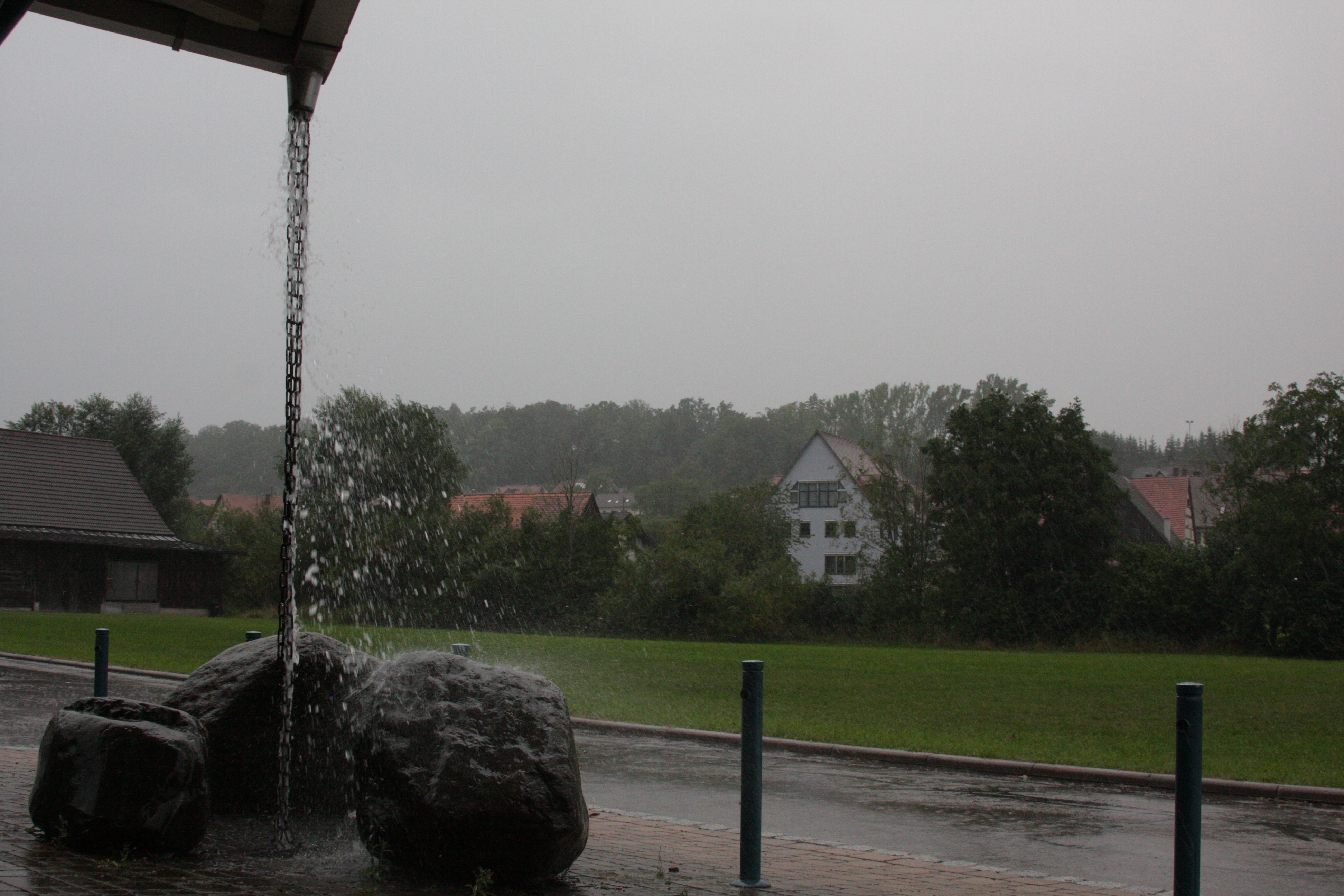 Die germanisch sprechenden Insassen scheinen uns wohlgestimmt. Mitleid haben sie nicht, dennoch versorgen sie und mit Wasser. Lebenswasser! Einer von ihnen wird uns heute als neuer Rekrut begleiten: Lukas wird Schild und Helm geschultert. Wir können kräftige und mutige Verbündete in unseren Reihen brauchen. Kurz vor dem heutigen Marschlager Waldtann greift uns Donar mit all seiner Macht wieder an. Er gibt nicht auf und schleudert uns Blitz, Donner und Regen entgegen. Wir lachen darüber und stellen uns unter. Heil Jupiter, schenk´ uns den Sieg und zeige Donar, wer der Stärkere ist. Und so ist es: dem Regen folgt Sonnenschein und der Rest der Tagesstrecke ist uns ein Leichtes. Unsere Ankunft in Waldtann nach 17 km wird von kräftigen Schlachtrufen begleitet. Der örtliche Wirt, ein Verbündeter (die heutige Abendration wird von ihm gestellt) begrüßt uns mit Lebenswasser. Das Marschlager wird auf der großen Dorfwiese aufgeschlagen, Schanzpfähle in den Boden gerammt und die Abendration aus dem Kessel über dem Feuer verzehrt. Die Dorfbewohner begrüßen uns ebenfalls und der Tagesauftrag, germanische Kinder mit Essensrationen zu versorgen, wurde erfolgreich ausgeführt. Dies berichtet unser Centurio.