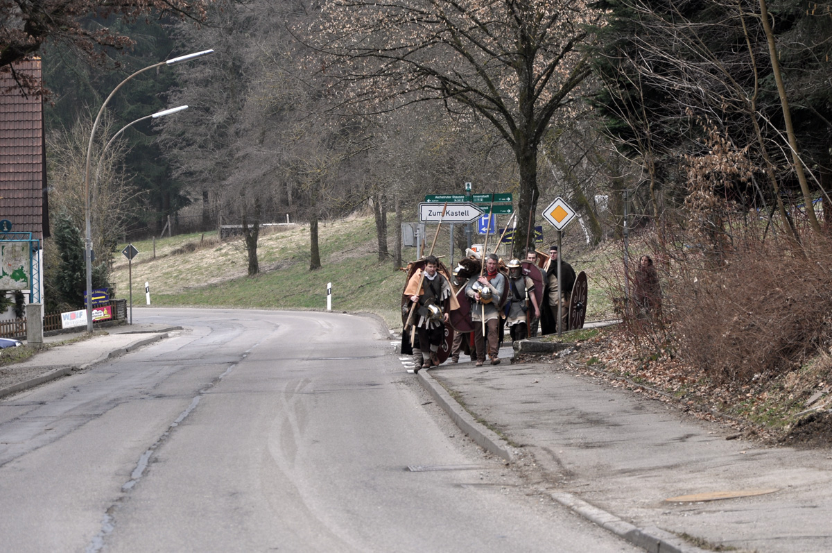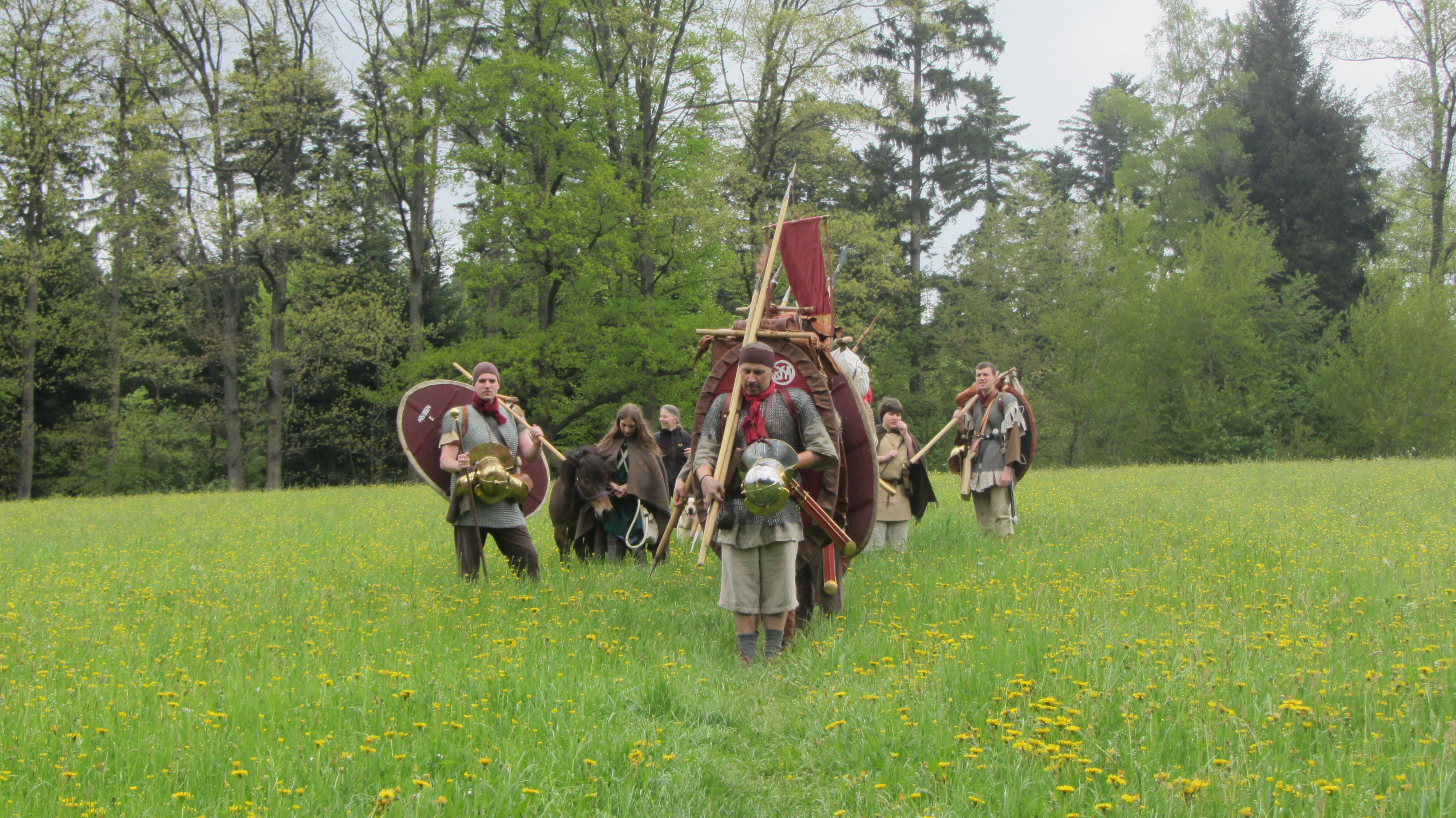 11. Maius 2766 a.u.c. (ab urbe condita): Die Einheit mit Troß und Kavallerie sammelte sich, verstärkt durch befreundete Legionäre und Auxilliare aus ganz Germanien. Der Feldzug wird ja im Kastell Aalen beginnen, weshalb eine Verlegung dargestellt wurde. Um die Mittagszeit wurde ausgerückt. Nur – wo sind die Germanen, fragten sich viele? Haben wir sie jetzt schon eingeschüchtert oder liegt es eher am Wetter? Es war wohl das Wetter, denn bewölkt war es bereits zu Beginn und kurz vor Pfahlbronn wurde unser Vorhaben durch den Gott des Krieges und des Wetters, Mars höchstpersönlich, einer ersten Prüfung unterzogen. Es regnet, nicht zu heftig aber doch etwas länger. Was für ein “Glück”. So konnte die Ausrüstung auf Wetterfestigkeit getestet werden und die Beteiligten auf deren Verträglichkeit. Den größten Teil der Strecke lachte aber doch hinter den Wolken immer wieder die Sonne. Das Gelände war teils gut geteert, teils grob geschottert, fester Boden oder einfach nur Matsch. Ging es doch abwechselnd auf gut ausgebauten Straßen oder einfachen Feldwegen und engen Waldpässen voran, teils ansteigend, andererseits wieder steil abfallend. Alles mit einer Menge Gepäck im Rücken.