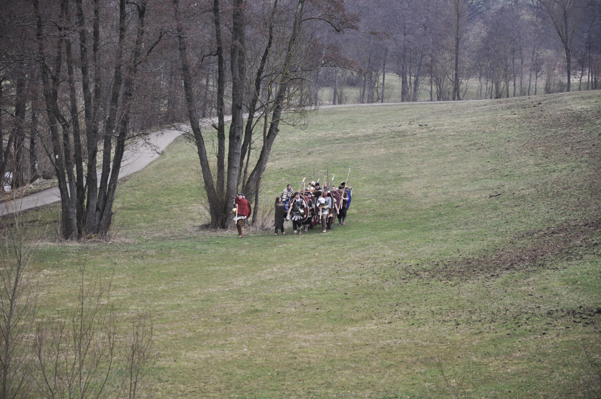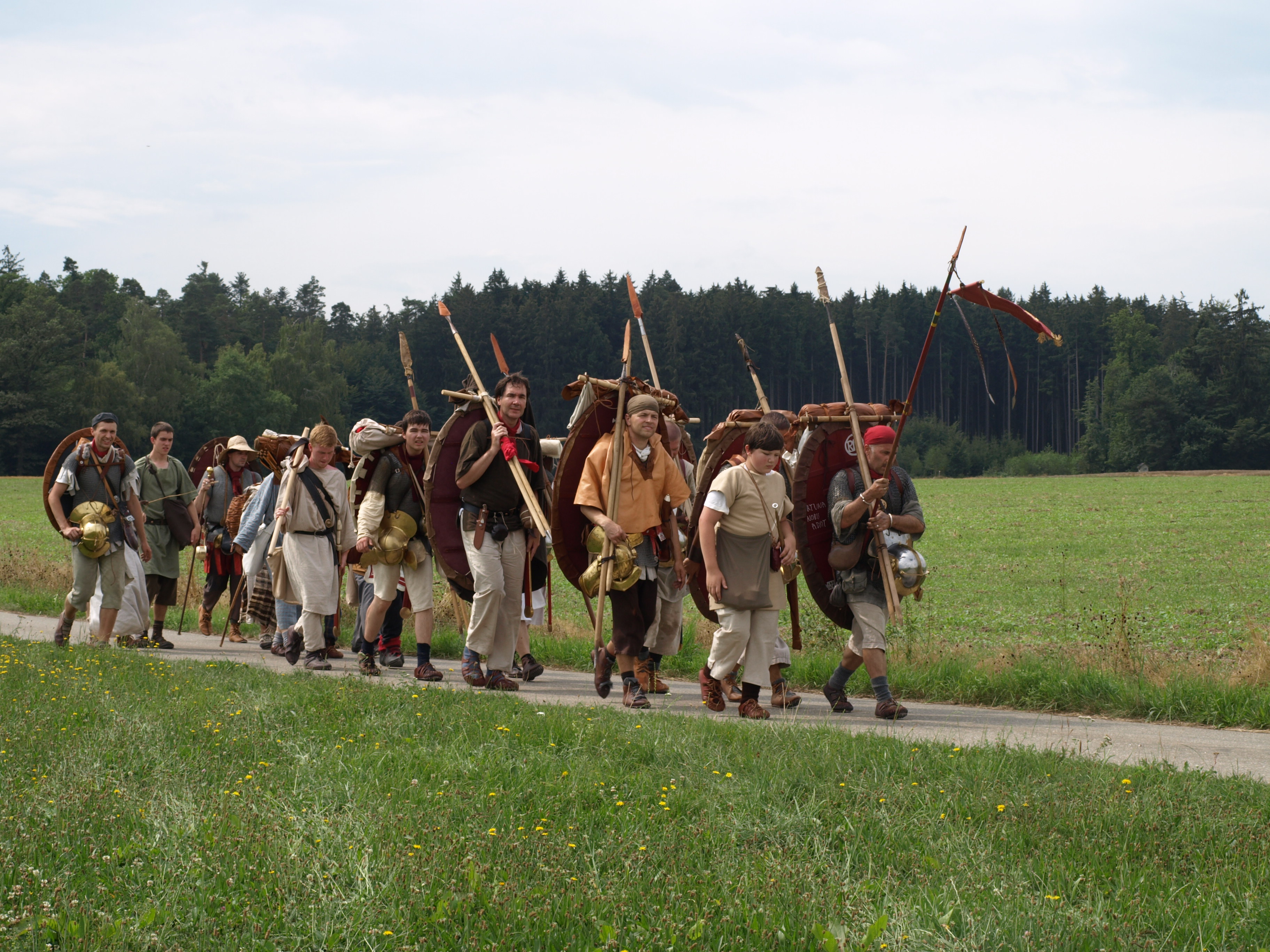 Mit ermutigenden Gesängen und Schlachtrufen kommen wir schnell voran, durchschreiten die Waldflächen und eine leichte Hochebene. Die Reiterei berichtet keine Vorkommnisse. Wir befinden uns schließlich noch auf römischen Boden. Zur Mittagszeit wird Pause befohlen. Wir befinden uns kurz vor dem Abstieg zum Fluss cochana. Nach Überschreitung der Brücke muss das Flusstal erklommen werden. Die Hitze tut ihr Übriges und erste Schwächen machen sich bemerkbar. Der letzte Marschteil steht an. Erschöpft, aber glücklich und mit letzten Schlachtrufen erreicht die Truppe nach 19 km das Marschlager Rainau, welches wir schnell aufgebaut und mit Schanzpfählen gesichert hatten. Unsere germanischen Verbündeten der Raetovarier haben das gemeinsame Essen zubereitet. Zwei Männer brauchen den Rat unseres medicus aufgrund ihrer Blasen an den Füßen. Der restliche Abend steht zur freien Verfügung. Dies wird im erfrischenden Nass des Sees genutzt. Eine abschließende Lagebesprechung beendet den Tag ohne nennenswerte Vorkommnisse. Lediglich die Seerettung eines Soldaten, der meinte im Kettenhemd schwimmen zu müssen, wird im Tagesbericht niedergeschrieben.