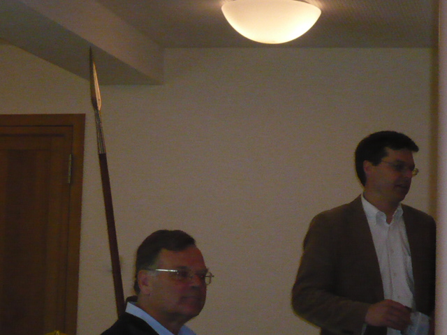 Am Bucher Stausee wurde auch gleich der Lagerplatz in Augenschein genommen. Anschließend wurde noch eine Exkursion ins Goldene Lamm nach Rainau – Schwabsberg unternommen. Dort hielt gerade Limes-Cicerone Roland Gauermann arglos einen Vortrag über den Verlauf des Feldzugs von 213. Zwei Miles nutzten die Gelegenheit zum Einmarsch und erklärten den (trotzdem angenehm) überraschten Cicerone kurzerhand im Namen des Kaisers für verhaftet. Geistesgegenwärtig konnte er sich aber umgehend durch eine großzügige Spende germanischen Gerstensaftes auslösen. Letztlich konnten die Beiden ihm bei seinen Erklärungen gegenüber den zahlenmäßig deutlich überlegenen Germanen beistehen und zu einem glücklichen Abschluss seines Vortrags beitragen.