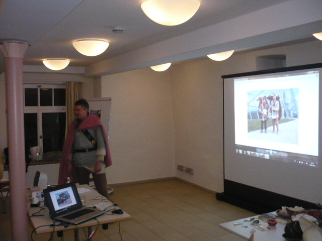 Beim Vortrag wurde von Herrn Gauermann ausführlich auf den historischen Zug des Caracalla eingegangen, beginnend vom Zeitrahmen bis hin zur Strecke, ausgehend von den Ausgrabungen am Limestor in Dalkingen, mit welchem er als ehem. Bürgermeister von Rainau ganz besonders vertraut ist (was ihm auch spürbar am Herzen liegt, nicht zu unrecht, da es sich schließlich um eine historische Sensation handelt.). Weiter wurde dann detailliert der weitere Verlauf des Feldzugs erläutert und fundiert begründet. Zur Auflockerung gab es einen kleinen Kurzfilm über die Geschichte des Limes in seinen verschiedenen Ausbauphasen. Schließlich wurde übergeleitet zum Projekt 1800 Jahre später. Hierzu wurde von Ralf Barth eine Ausrüstung ausgestellt und im Detail erläutert.