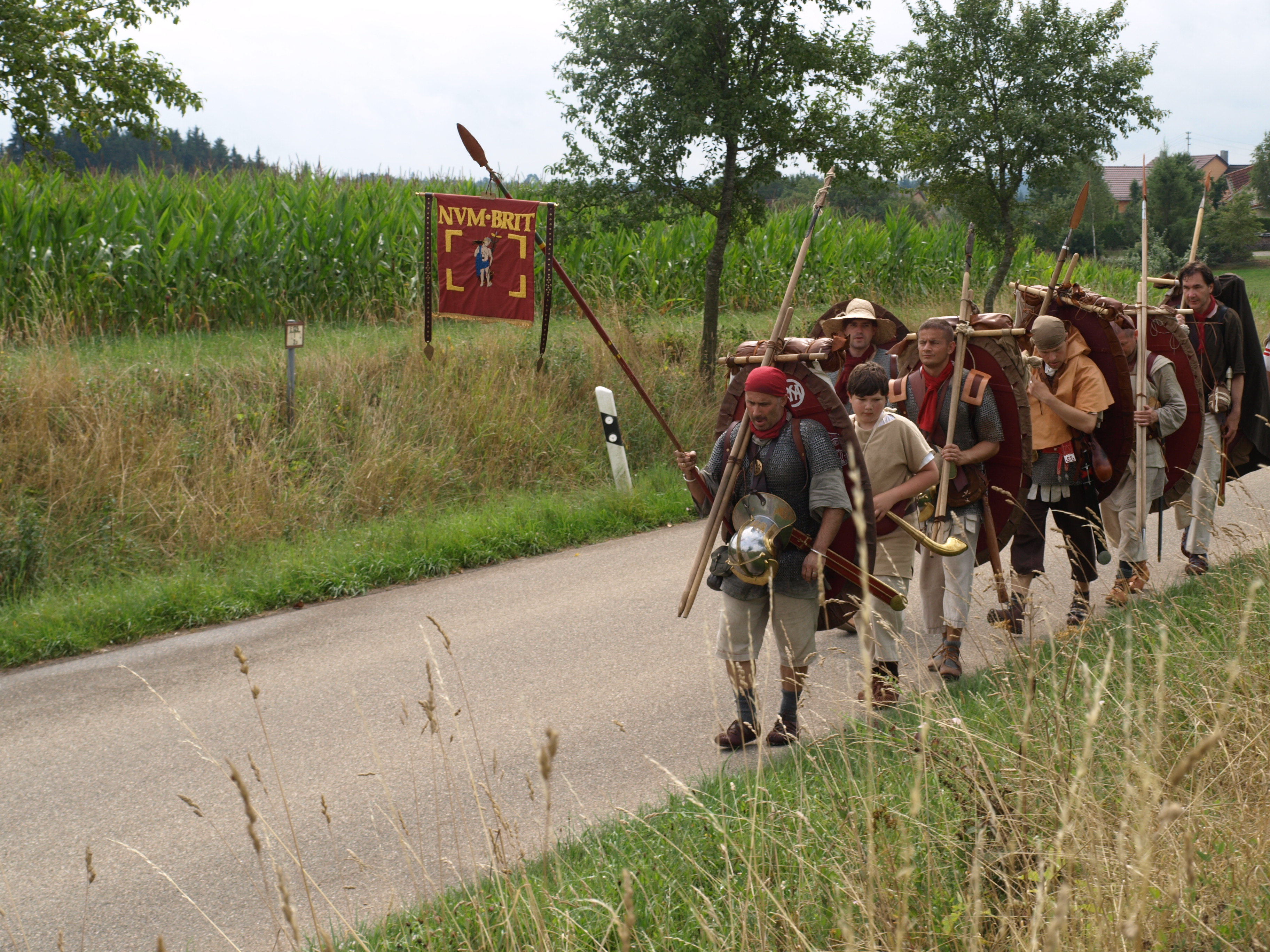 Der Numerus Brittonum marschiert mit 16 Schwerinfanteristen, 4 Leichtinfanteristen, germanischen Kundschaftern, 1 Meldereiter und 2 Packpferden. Erstes Marschziel wird das Kastell Rainau und die dortigen Bäder sein. Mir, Flavius Valentinus, wird die Ehre zu Teil, die Truppe als Vexillifer anführen zu dürfen.