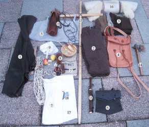 (1) Cucullus: Lederregenschutz (2) Caracalla Wollmantel (3) Ersatzgarnitur: Tunika, Hose, Socken (4) Pera: Ledertasche (5) großer Leinensack (6) Gürteltasche z.B. für Schreibutensilien(o.Abb) (7) div. Leinensäckchen (8) der römische Game Boy – das Würfelspiel (9) Getreideleinensäckchen (hier ca. 500gr befüllt) (10) Obst / Äpfel (11) Essbesteck(Holzteller, Holzlöffel, Messer in Holzscheide) (12) Reticulum: Proviantnetz (13) Gebrauchsmesser (14) Beil & „Hammer“ mit Eisenkette (15) Furca: Tragestange (unserem Nobbe sei Dank) (16) Schaffell(welches jetzt meine Mutter hoffentlich nicht sucht) (17) Leinentuch (Handtuch. Abtrockentuch) (18) römisches Feuerzeug: Feuerstein & Schlageisen – Zunderschwamm o.Abb. (19) Wasserschlauch (1L) mit div-Lederschnüren um „schwankende Ausrüstungsteile“ fest zu zurren (20) Geld(Gold)beutel & Hygienebeutel (z.B.für Rasierzeug, Kamm… – o.Abb.) (21) Patera & Situla (Kaserolle & Eimer) – o.Abb.