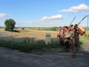 Zum wiederholten Mal ging es an den Limes zur Patrouille. Diesmal wieder mehr als ein Soldat. Denn die Erfahrung lehrt nicht nur den Umgang mit der Ausrüstung, wie man sie am schnellsten anlegt und das Gepäck am besten verstaut und das Ganze dann optimal am Körper verteilt dahinschleppt. Sich alleine auf den Marsch vorzubereiten und in sengender Hitze vor sich hin zu trotten, nein, dass nichts für gesellige Soldaten. Beim gemeinsamen Marschieren tauscht man sich über bisherige Erfahrungen, aufgetretene Probleme mit der Ausrüstung und die Auswirkungen auf die Kondition und den eigenen Körper überhaupt aus. Auch werde Überlegungen angestellt, wie die eigene und allgemeine Motivation aufrecht erhalten oder angeschoben werden kann. So wurde schon viel optimiert, weshalb es diesmal keinerlei Probleme gab. Nur die Hitze machte einem zu schaffen, aber auf einem solchen Marsch gewöhnt man sich auch daran – und eh man sich versah waren auch schon über 5 römische Meilen geschafft. Über 7 Kilometern für einen Feierabendrundmarsch: Das lässt einen zuversichtlicher und ruhigeren Gemütes auf die Belastungen des anstehenden Marsches blicken.