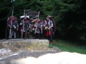 Am nächsten Morgen ging es früh weiter. Das Wetter war wieder schlechter während des Marsches, es regnete immer wieder kurz. Zuletzt ging es wieder durch den Wald, die Wege wurden anspruchsvoller, bis sie nur noch wage zu erahnen waren. Hier wurde die Provinzgrenze von Obergermanien nach Raetien überschritten und den Fines, den Grenzgottheiten geopfert. Kurz danach war der erste Gefallene zu beklagen, er fiel aber ohne Feindeinwirkung aufgrund des rutschigen Untergrundes. Wieder eine Erfahrung mehr für ihn. Deshalb hatten die richtigernRömer genagelte Schuhe! Nach einer kurzen Wegstrecke am Rotenbach entlang endete der Marsch unterhalb des Kleinkastells Freimühle bei Schwäbisch Gmünd.